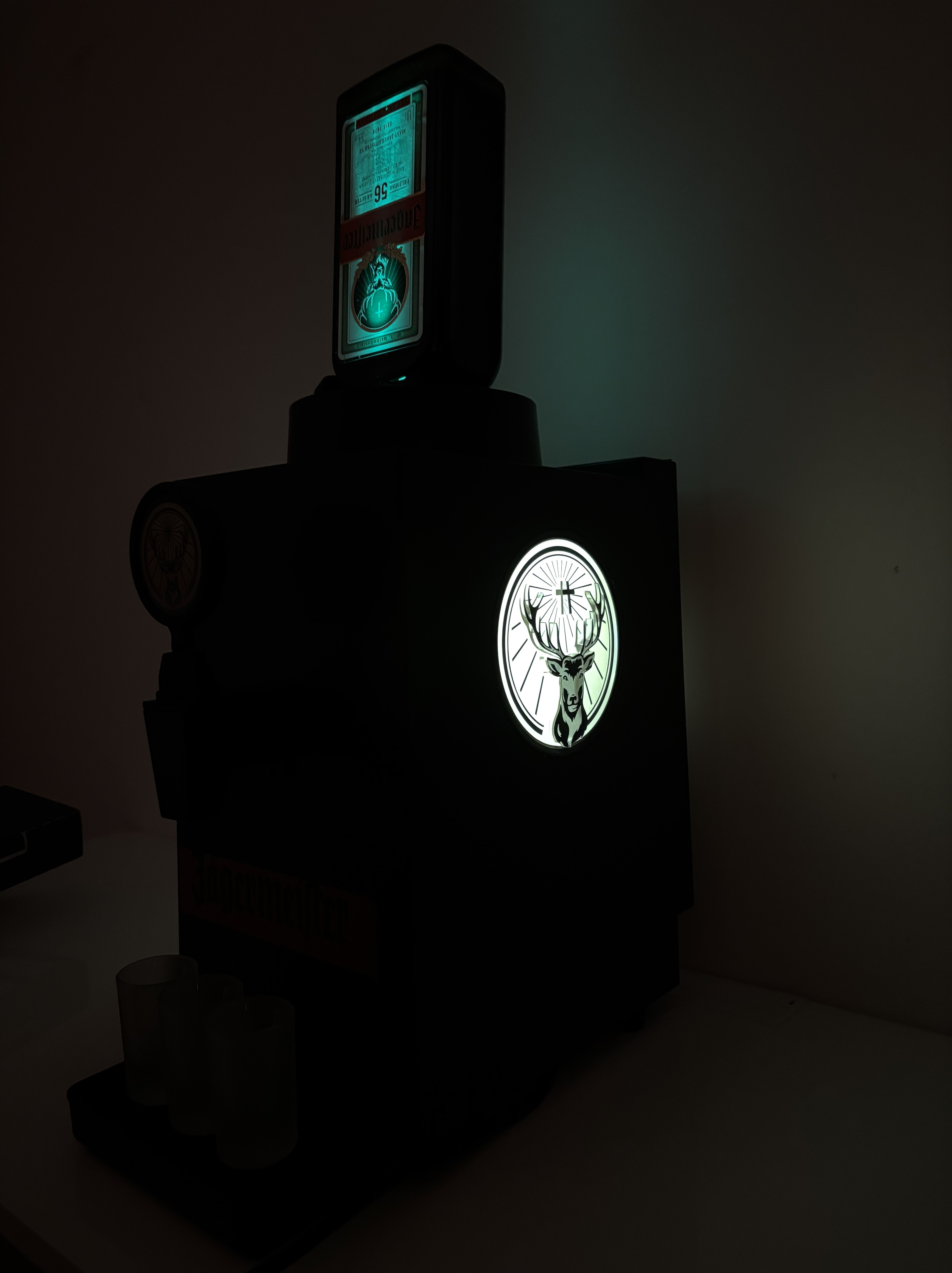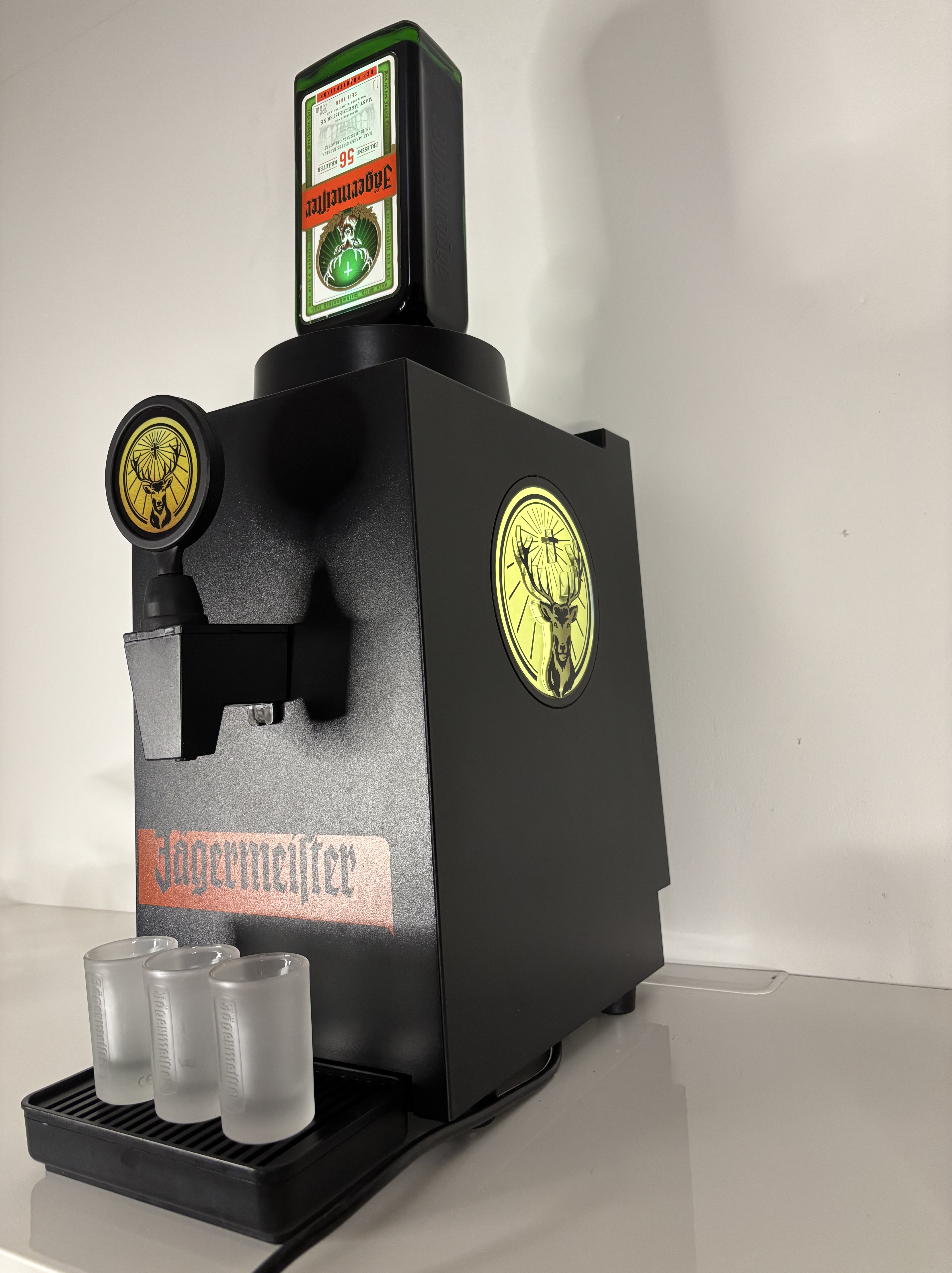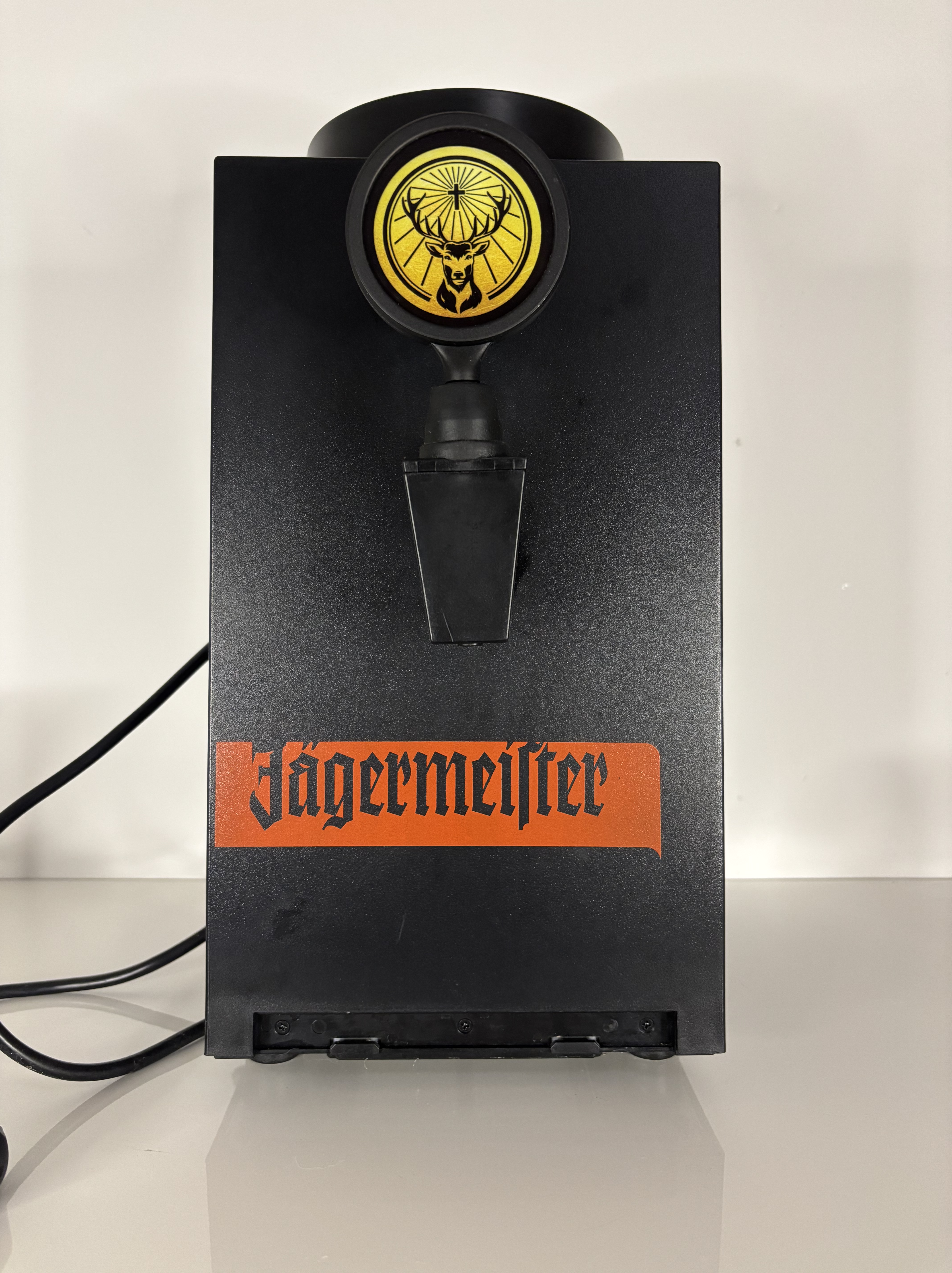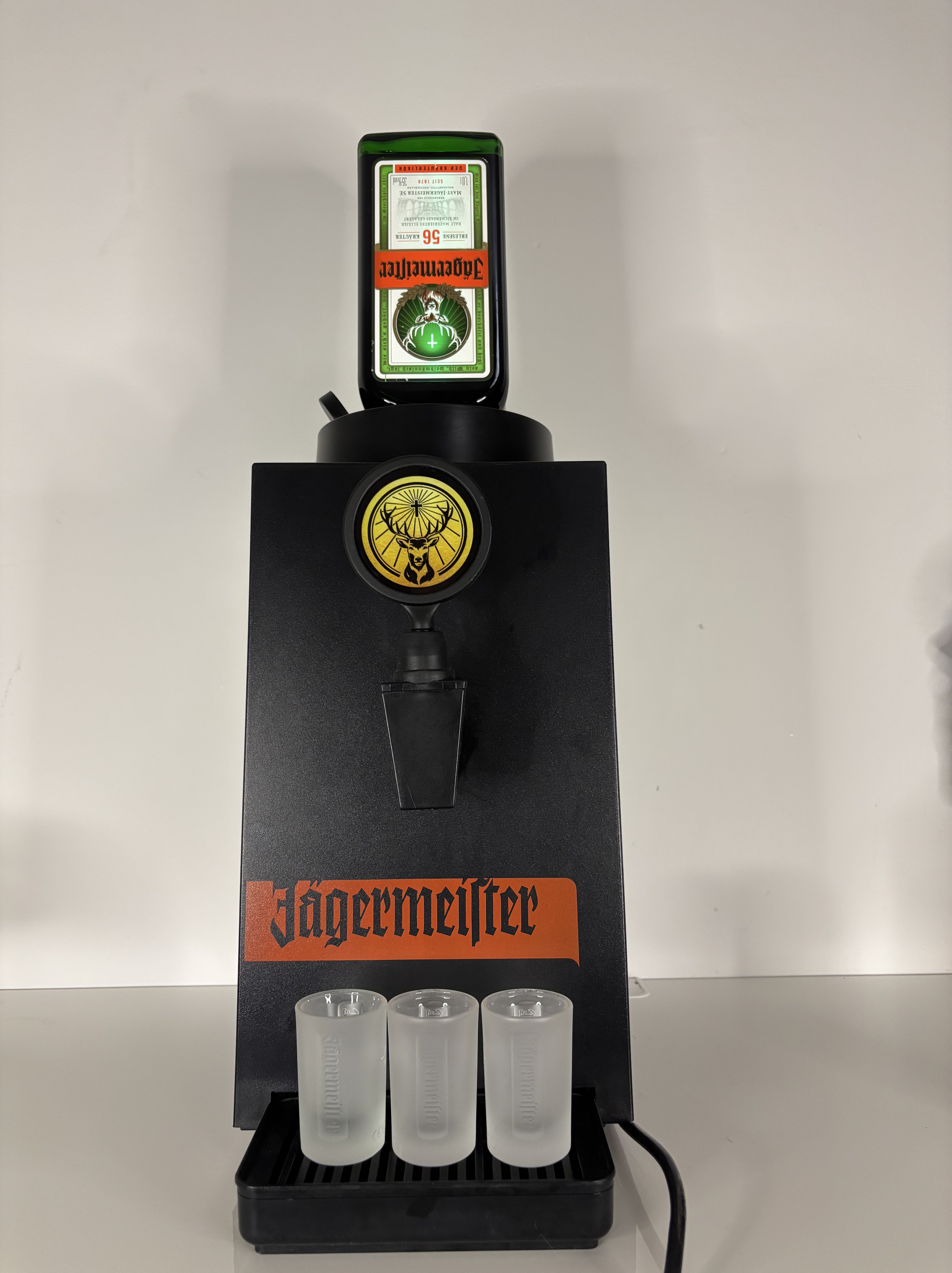 Diese Zapfanlage kann an eine ungekühlte Flasche Jägermeister angeschlossen werden und sie kühlt diesen in kürzester Zeit auf eine perfekte Trinktemperatur herunter. Für einen Aufpreis von 5,95€ könnt ihr je 12 optisch passenden Schnapsgläser und Serviermatte dazu mieten.